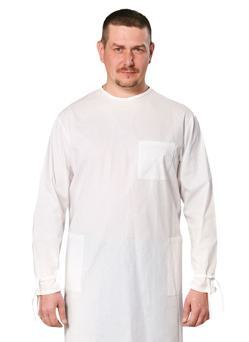 Длина халата ниже колена, рукава длинные, карманы накладные, завязки сзади.