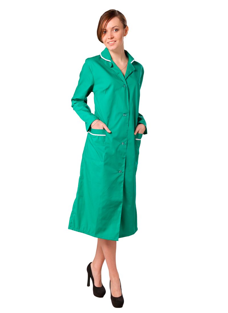Халат с центральной бортовой застежкой на пуговицы. Полочки с нагрудными вытачками, с двумя нижними накладными карманами. Спинка с хлястиком на 2 пуговицы, втачанным в боковые швы. Воротник отложной, с лацканами. Край воротника окантован белой косой бейкой. Рукава втачные, одношовные.