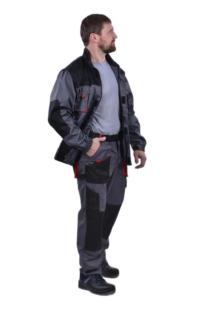 Брюки мужские с застежкой гульфика на тесьму «молния» и притачным поясом с красными шлевками. Передние половинки брюк с 2 боковыми накладными карманами с наклонным входом. На левой половинке в области колена дополнительный карман.