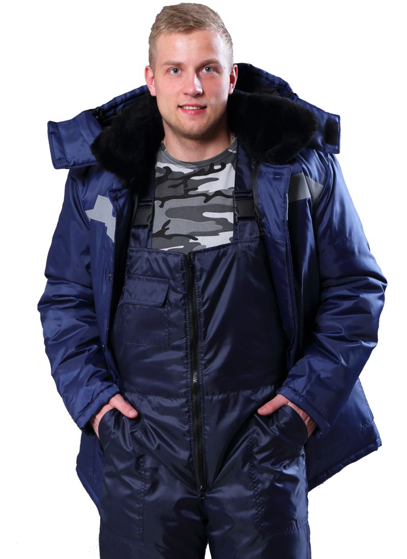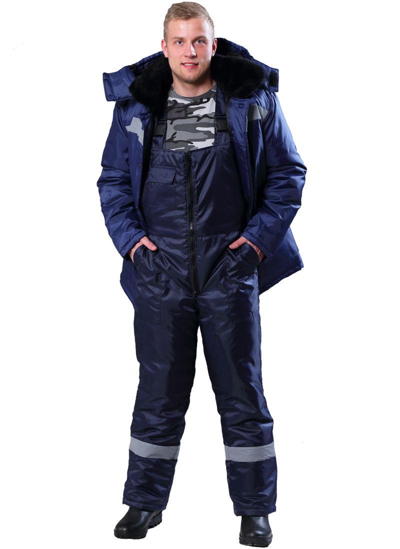 Полукомбинезон мужской утепленный отрезной по линии талии, с застежкой на тесьму «молния». На передних половинках два накладных кармана с наклонным входом. На правой полочке накладной карман с клапаном. СОП 50 мм расположен по низу полукомбинезона.